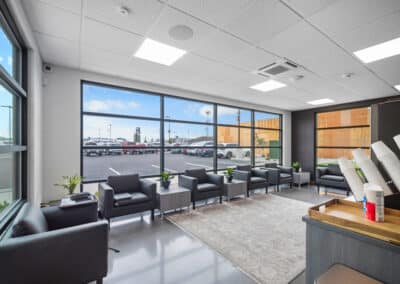 The sales building was designed to create a welcoming, streamlined customer experience, incorporating showroom space, sales offices, and support areas. Adjacent to the showroom, the detail shop is optimized for efficient vehicle processing and daily operations, supporting high-volume inventory turnover.
